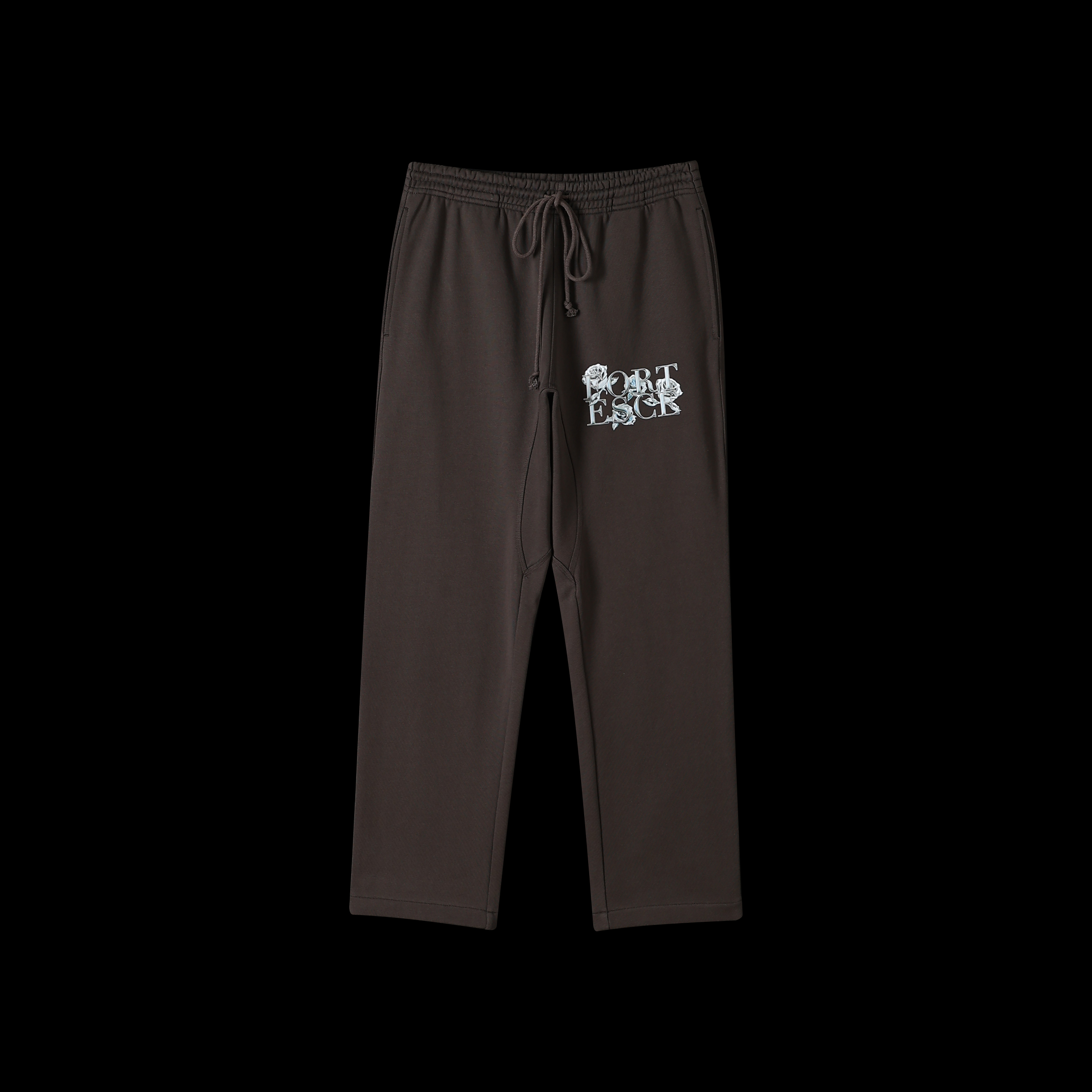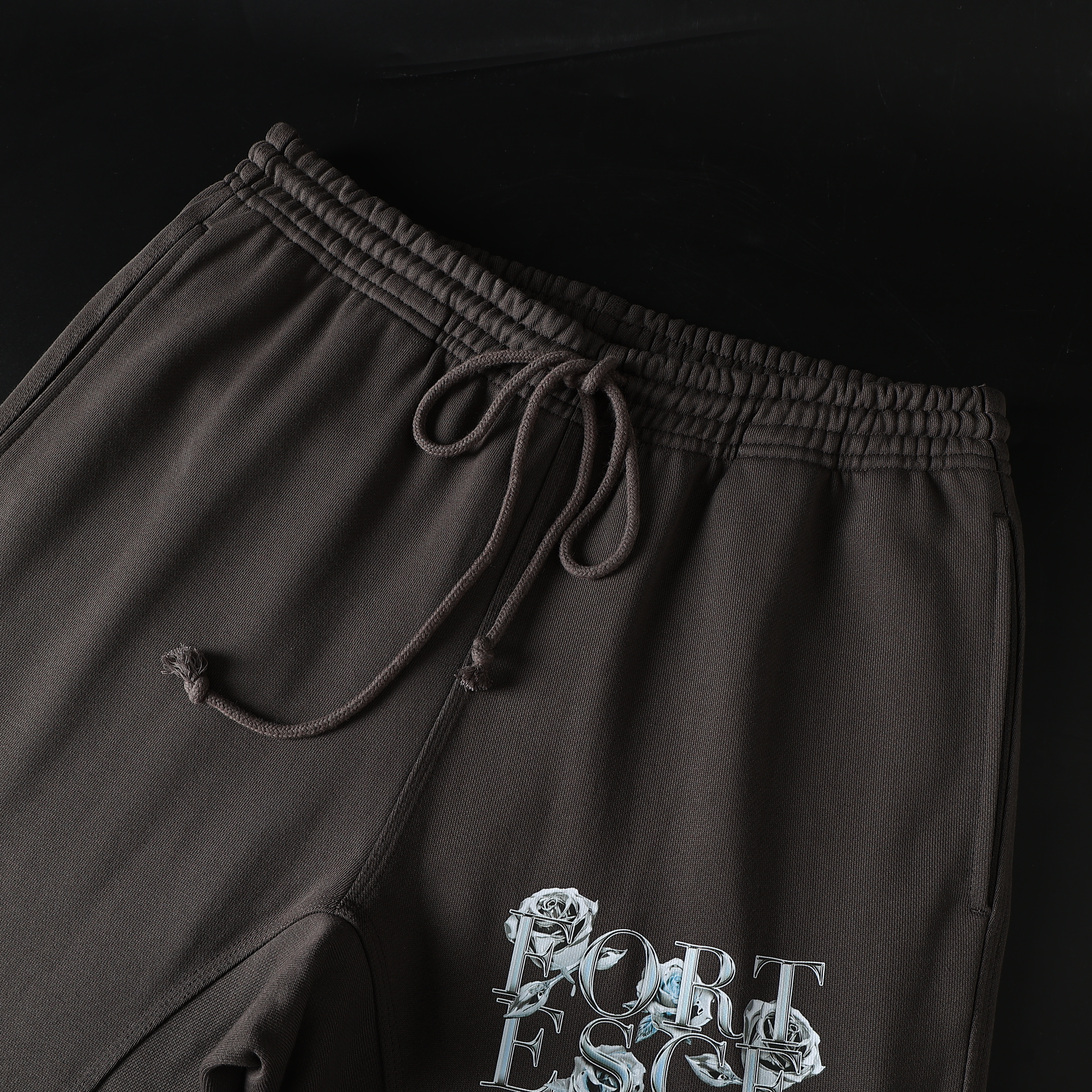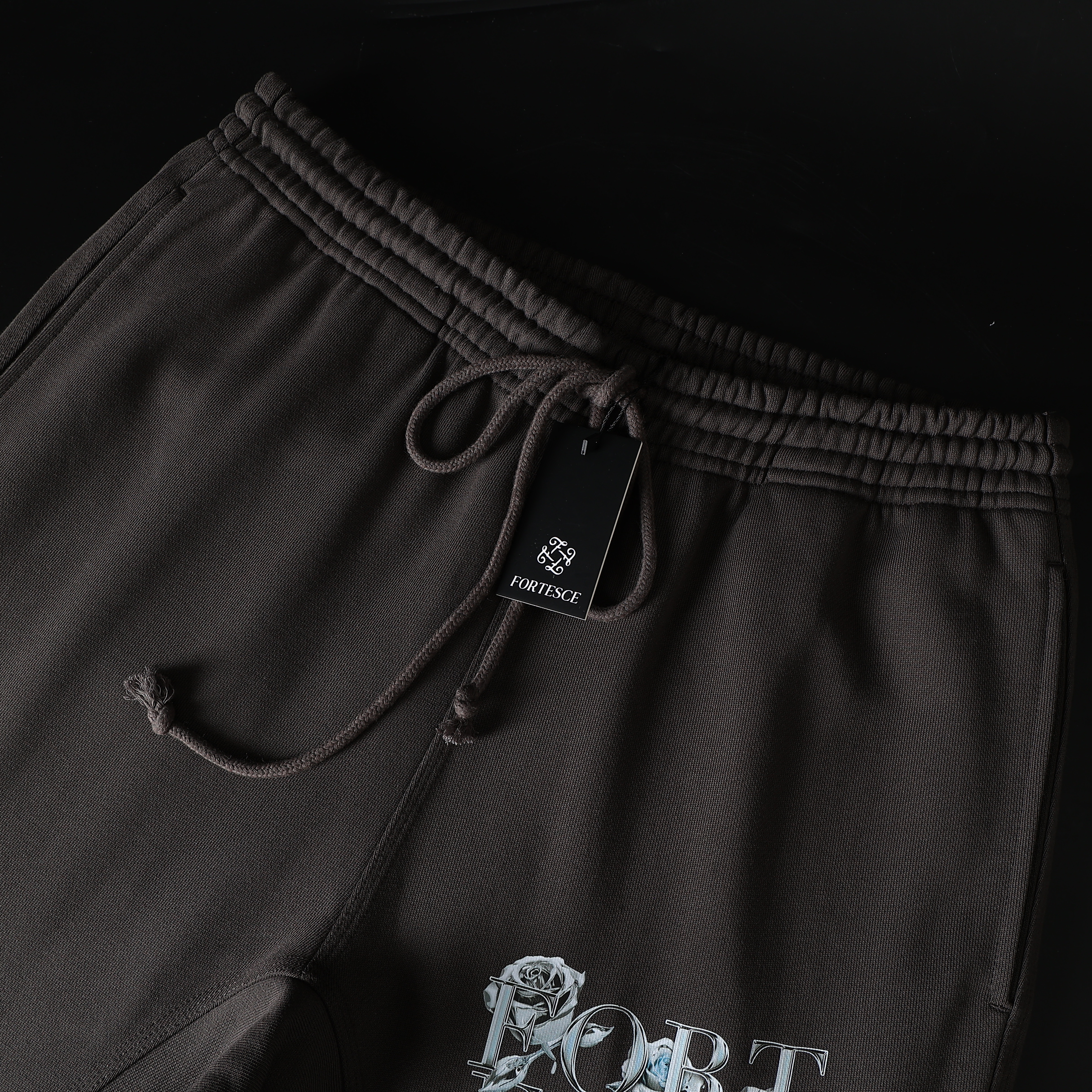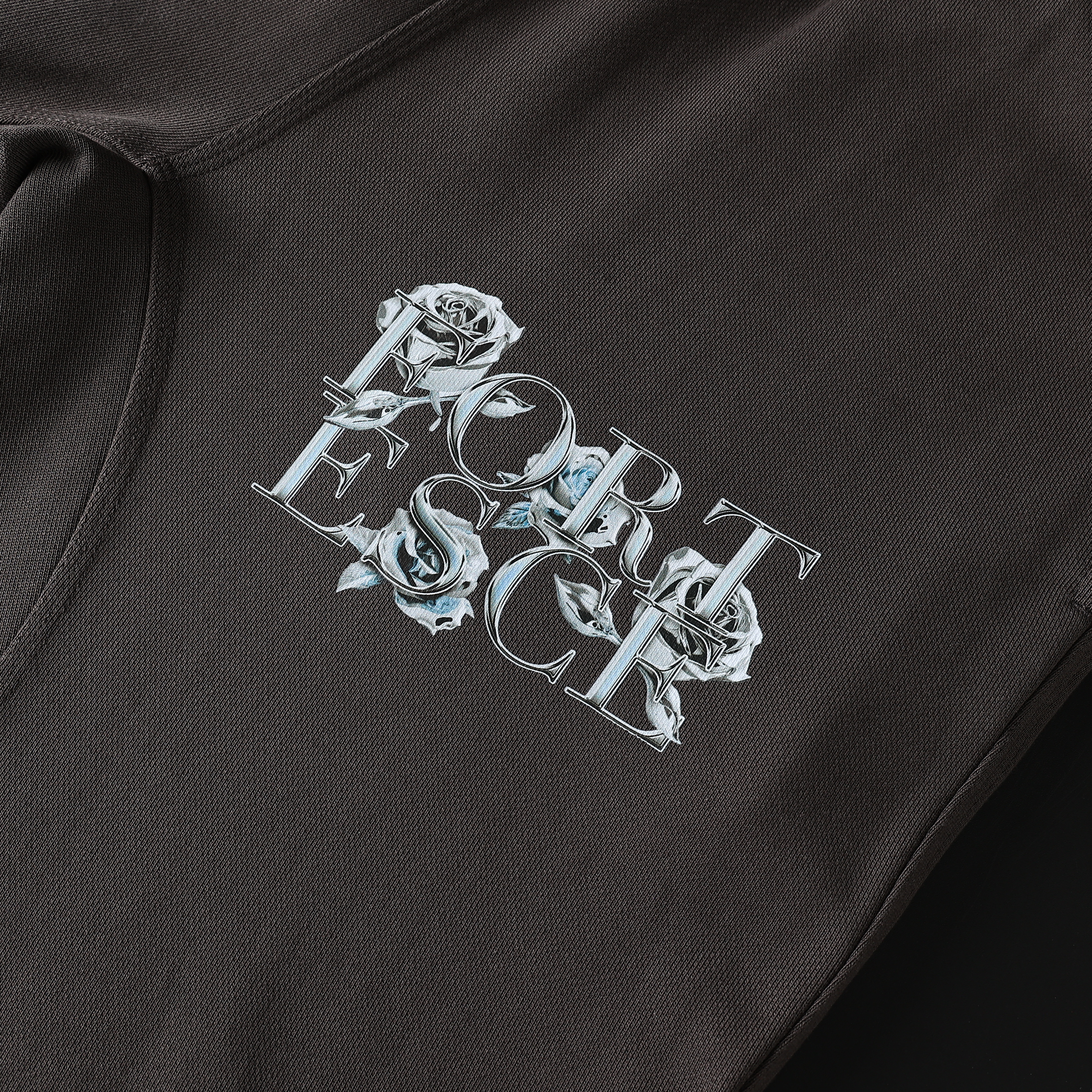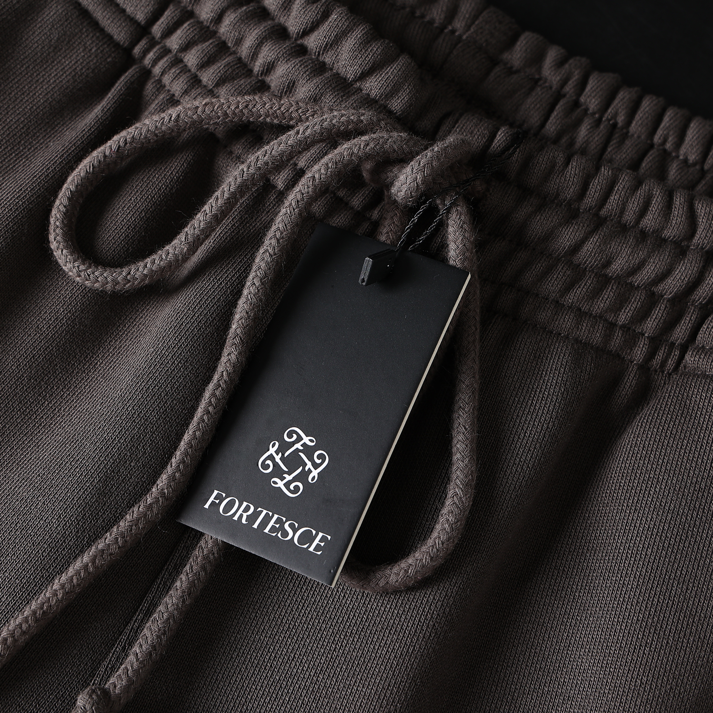 Oversized heavyweight joggers in charcoal dark grey. Designed with a relaxed, straight-leg fit and no cuffs for a clean drape. Crafted in premium French Terry organic cotton with drawstring waistband for adjustable comfort. Fortesce Chrome Lux graphic applied via direct-to-garment print on thigh.